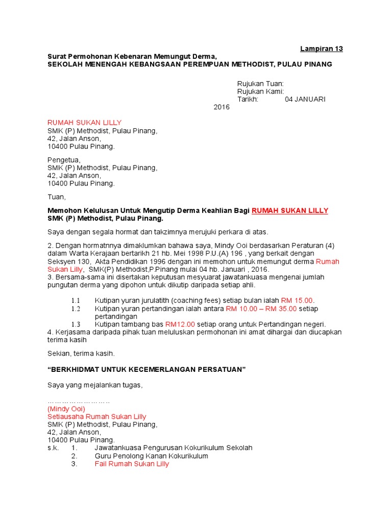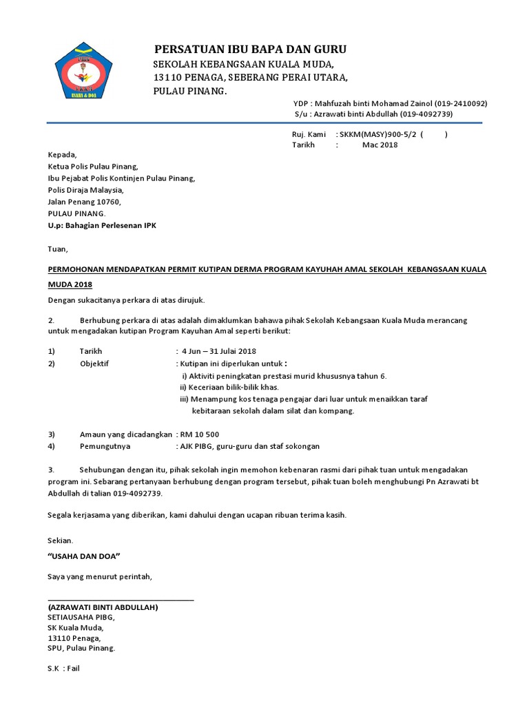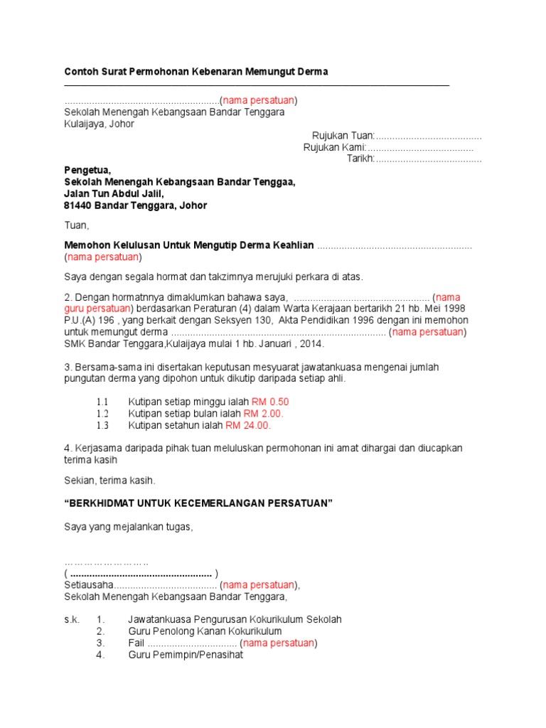 Contoh Surat Kebenaran Mengutip Derma / Muat turun contoh surat kutipan derma.. Muat turun contoh surat kutipan derma. (rujuk lampiran 14 ) 2.3 surat pemberitahuan sekolah kepada ibubapa/penjaga berkaitan penglibatan anak/jagaannya dalam kokurikulum. Berhubung perkara tersebut di atas saya selaku bendahari kelab petanque smk perantau damai dengan penuh rasa tanggungjawab memohon kebenaran untuk mengutip derma keahlian. Contoh surat kebenaran mengutip derma 1 1 2 duim in mm 10 may public holiday malaysia 2019 calendar with public holidays in nigeria 1 kati bersamaan berapa gram 1 kati berapa gram 22 usd to rm 1 dekad bersamaan dengan berapa tahun 1 1 2 birthday cake 1 kaki bersamaan berapa inci 1 kaki bersamaan berapa cm 6.semua penerimaan pungutan hendaklah diakui dengan resit.