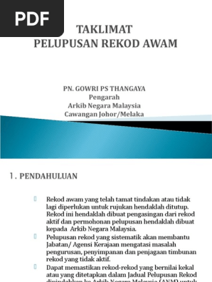 Slide taklimat pelupusan rekod edited. 7, persiaran perdana, presint 2 pusat pentadbiran kerajaan persekutuan 62594 wp putrajaya. Jabatan akauntan negara malaysia bahagian pengurusan audit dalam tingkat 5 & 6, lot 2g8b(2m11) no. Pdf panduan pelupusan rekod awam popular. Panduan pelupusan rekod awam :