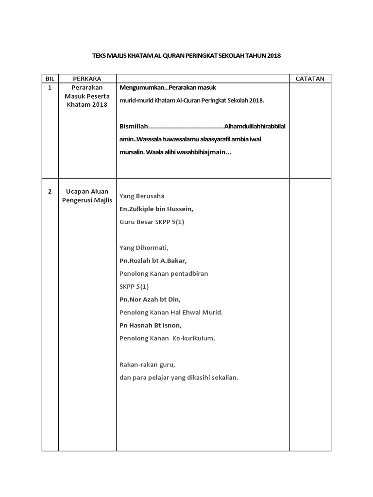 Teks Majlis Khatam 2014 from image.slidesharecdn.com Contoh teks ucapan pengerusi majlis. Jika ada, ianya kebetulan dan takdir semata. Use the download button below or simple online reader. Majlis merakamkan ucapan terima kasih kepada encik mohd anuar bin selamat atas ucapan perasmian penutupan sebantar tadi. Untuk menyempurnakan penyampaian hadiah, majlis dengan segala hormatnya mempersilakan encik mohd anuar bin selamat dengan diiringi puan nur nadia. Senarai qari dan qariah yang akan. 2 mac 2016 anjuran sarjani bin sharif guru besar sekolah kebangsaan sungai manggis pengerusi 1 : Majlis menghafaz al quran peringkat kebangsaan 2017 ahmad luqman ahmad zaini melaka.
